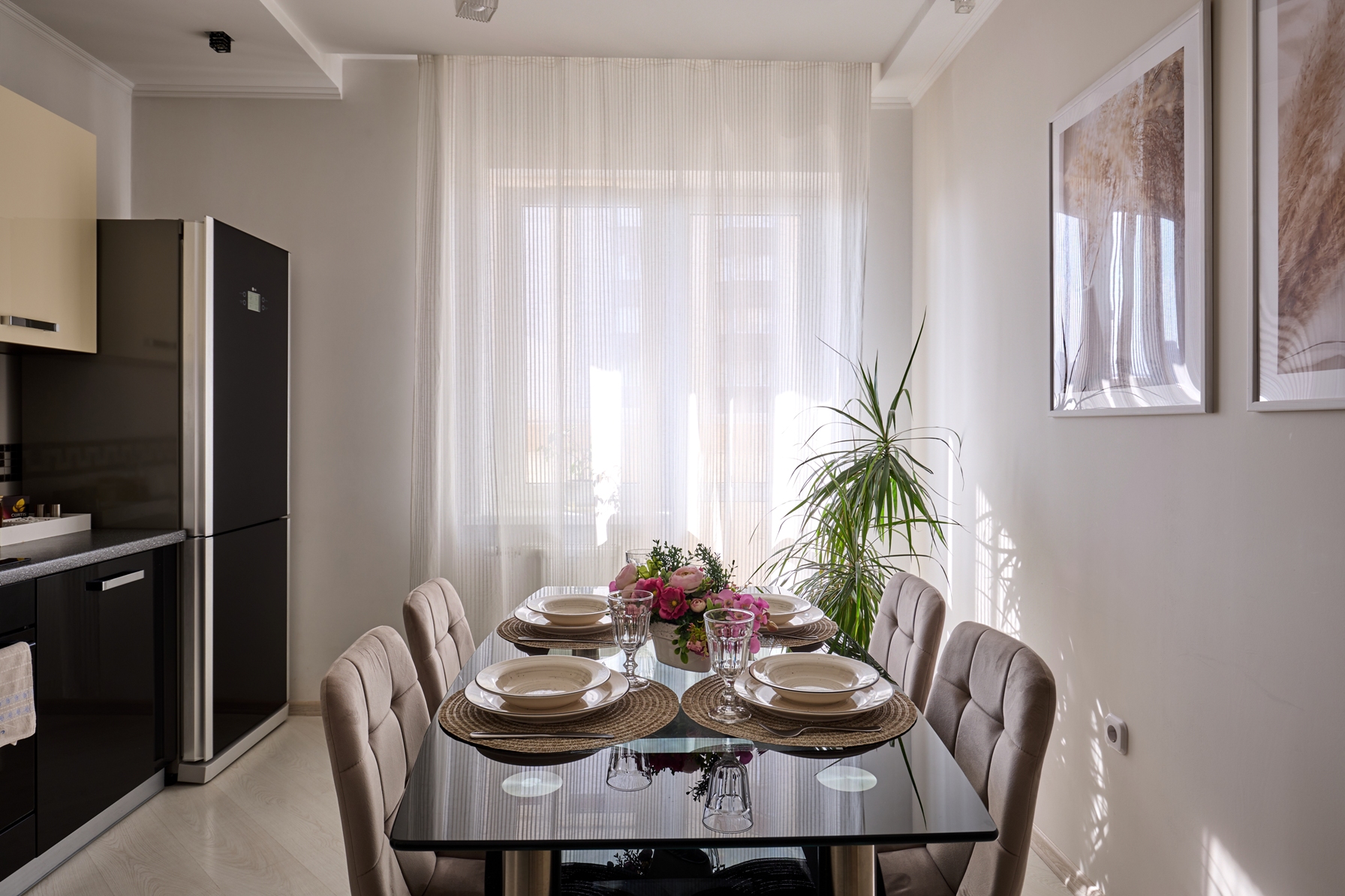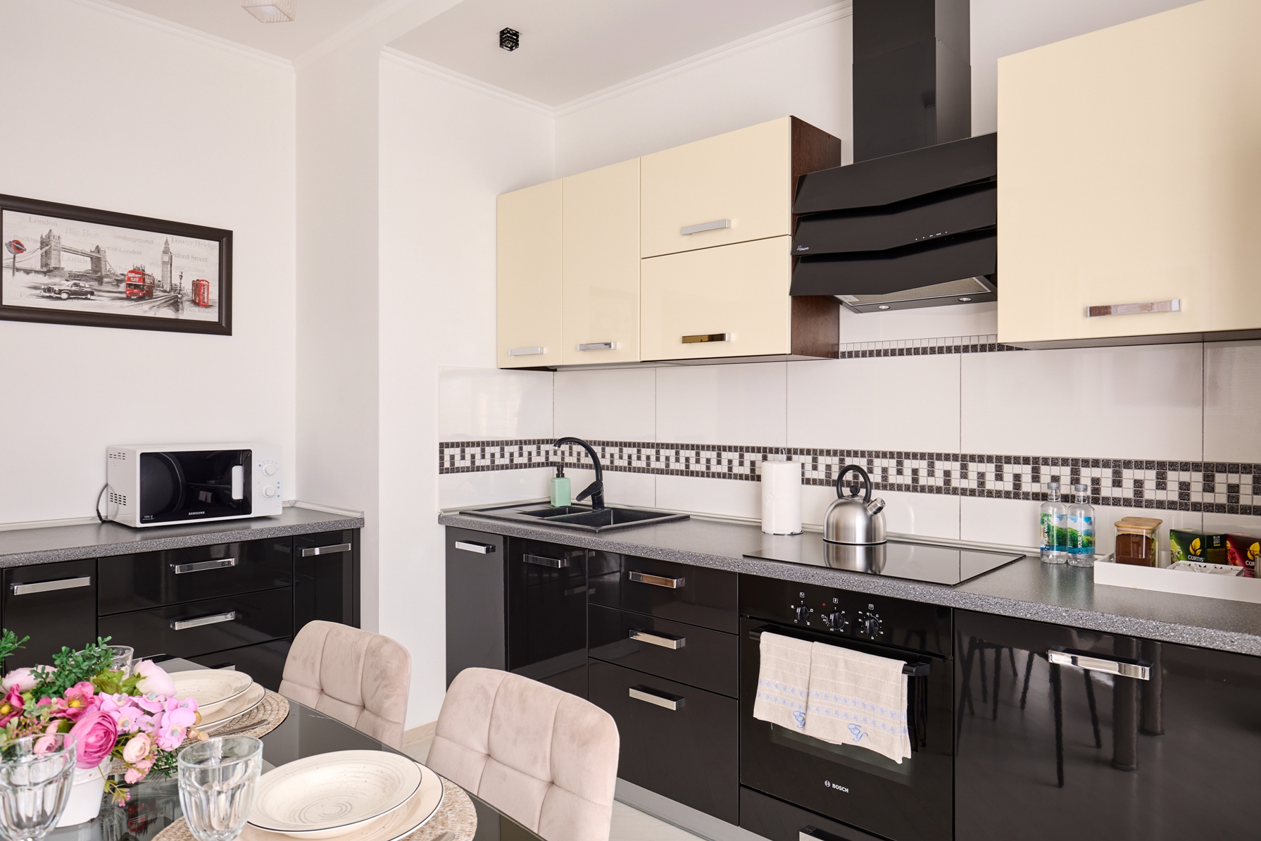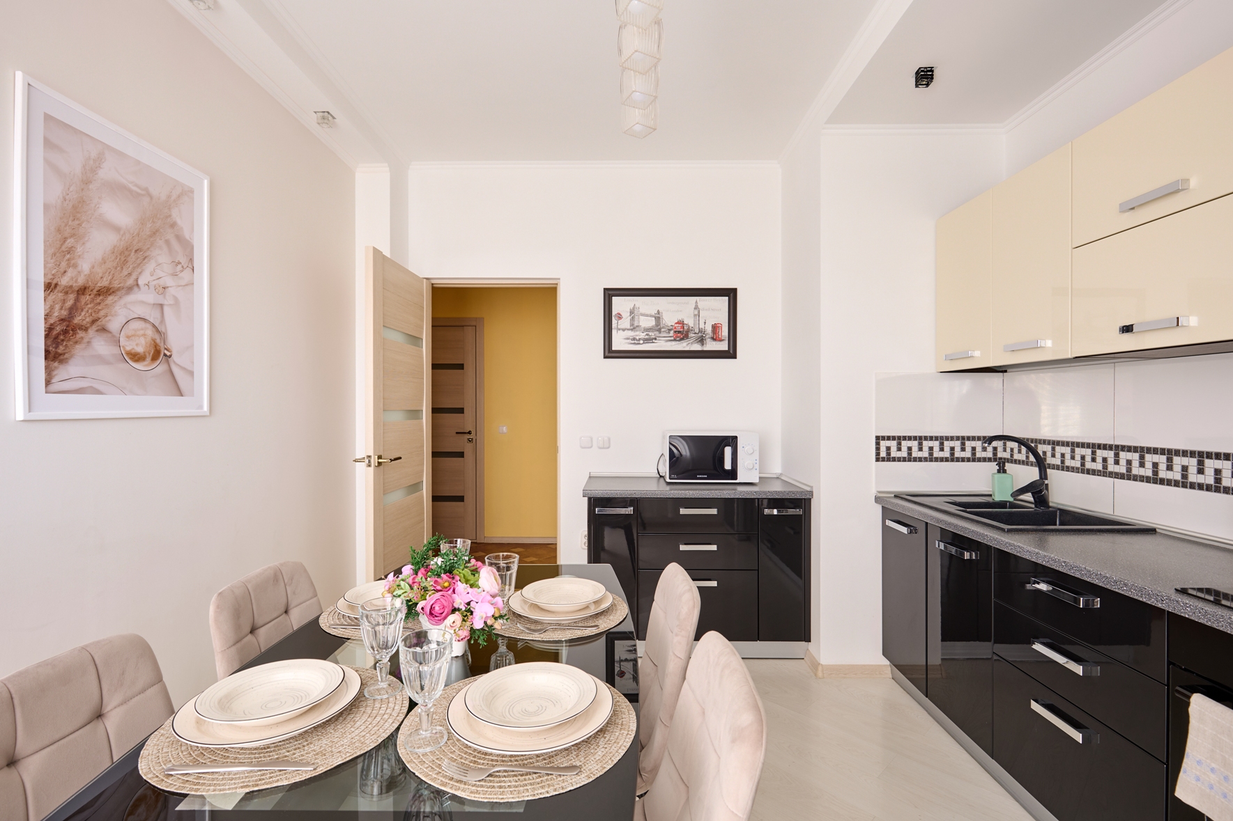 Эти высотки построены в живописном месте с видом на реку и лесопарковую зону. Буквально за пару минут можно сбежать из шумного города в приятную тишину и прохладу заповедного леса. Урочище «Пышки» предлагает все условия для приятных прогулок (проложены дорожки, оборудованы скамейки, действует прокат велосипедов). С другой стороны дома располагаются местный рынок, магазины, кинотеатр, ресторан и ночные клубы. Так что скучать в этом месте никому не придется, каждый гость найдет себе развлечение по душе. Стильная и модная квартира, удачно расположенная возле парка и обеспеченная всей техникой.