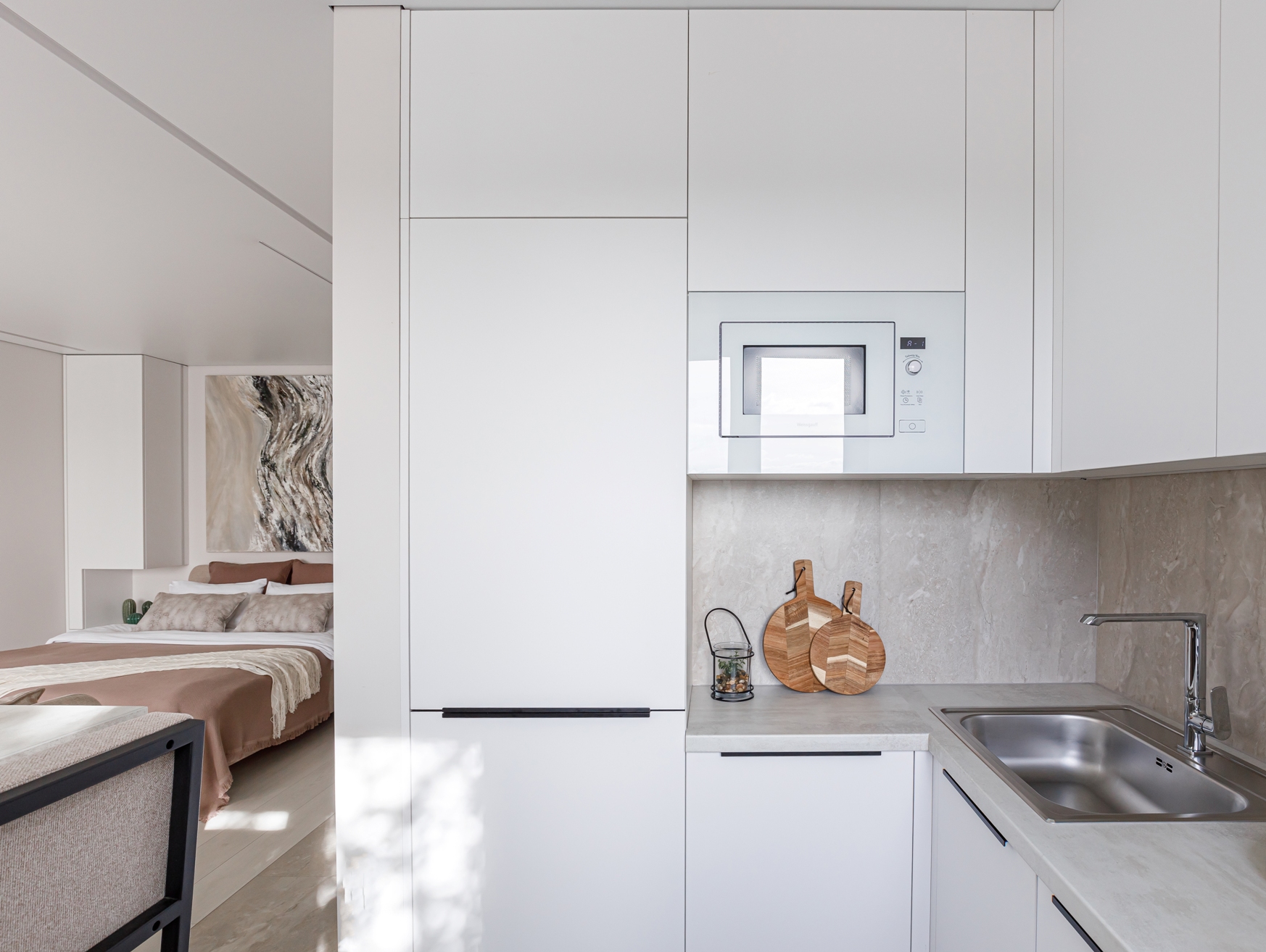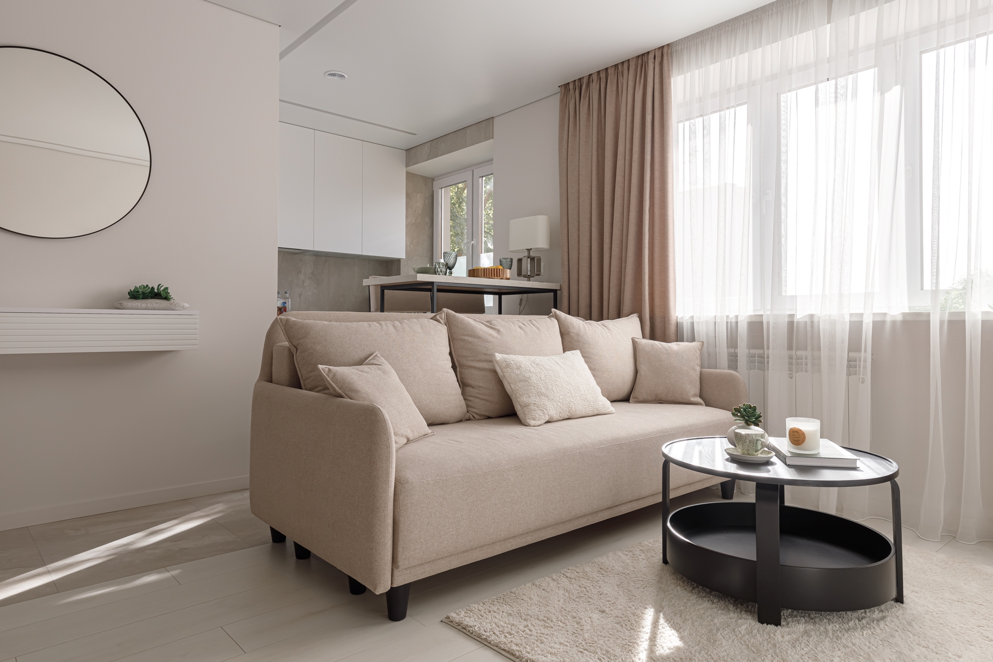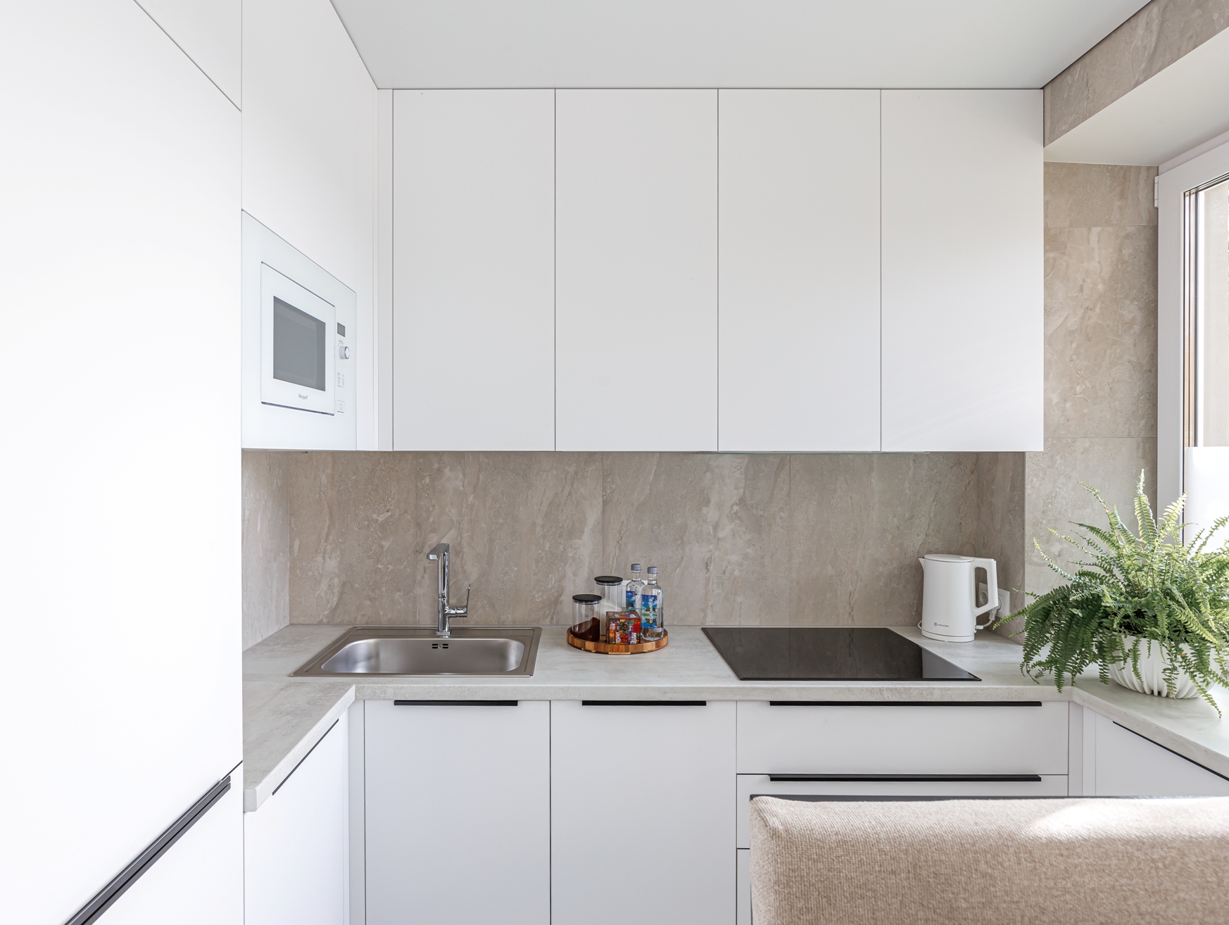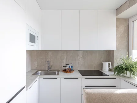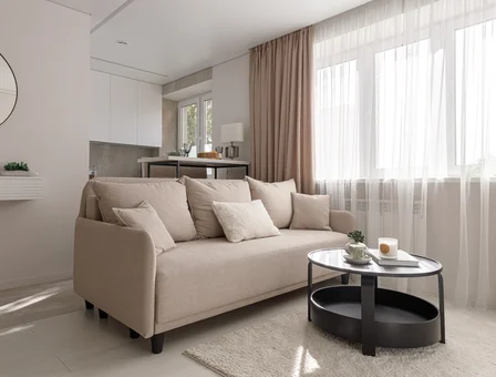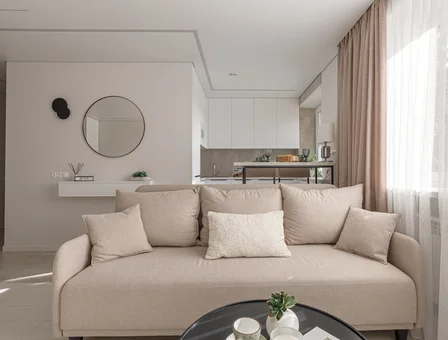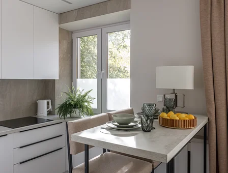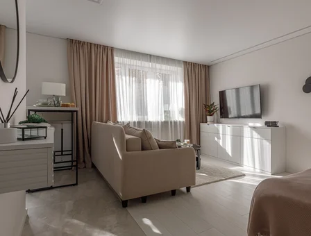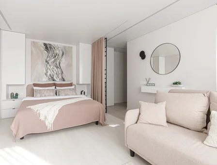 В апартаментах сделан дизайнерский ремонт в лаконичных светлых тонах, а обстановка продумана до самых мелочей. Среди удобств гостиной зоны: большая двуспальная кровать, раскладывающийся диван, журнальный стол и телевизор. Кухня оборудована плитой, микроволновой печью, посудомоечной машиной и прочей современной техникой, которая пригодится для приготовления любимых блюд.