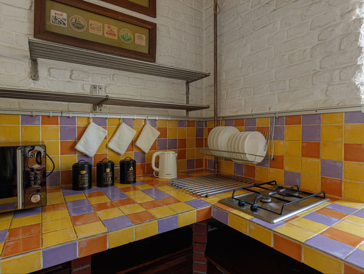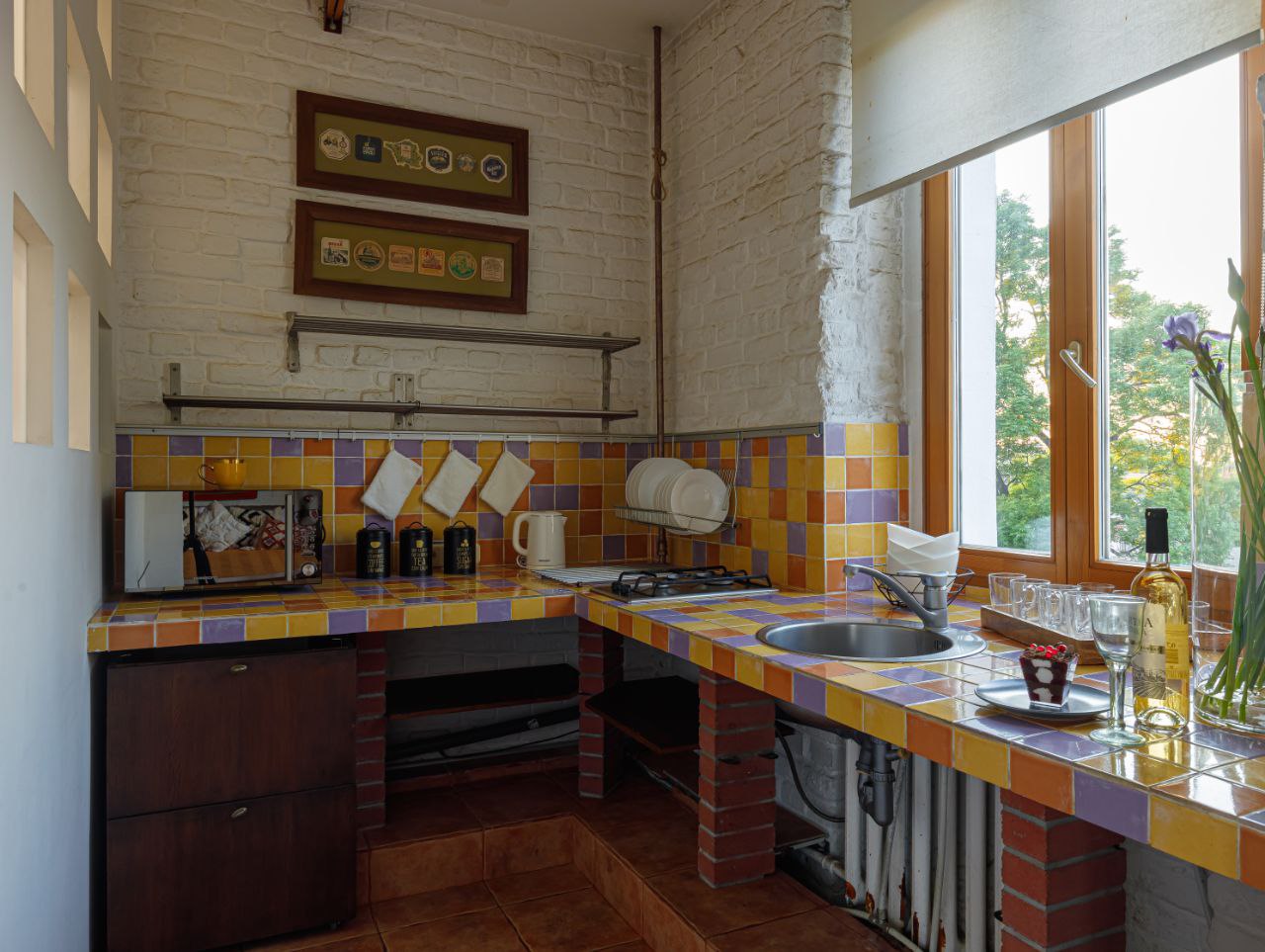 Кухня: холодильник, СВЧ-печь, посуда для сервировки и приготовления пищи, чай, кофе, сахар, чистая вода.