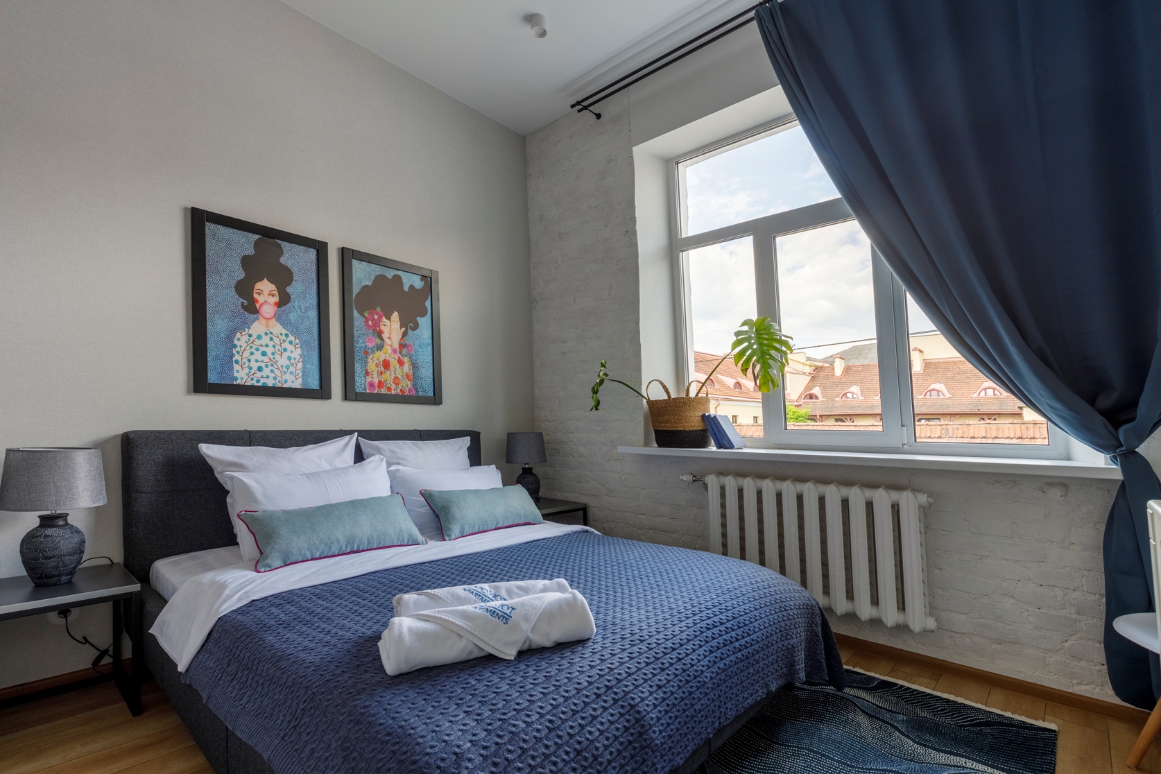 Помимо удобного расположения гостей порадует дизайнерский интерьер и оснащение квартиры. На фоне нейтральной отделки отлично смотрится яркая мебель, картины в стиле постмодерн и живые цветы.