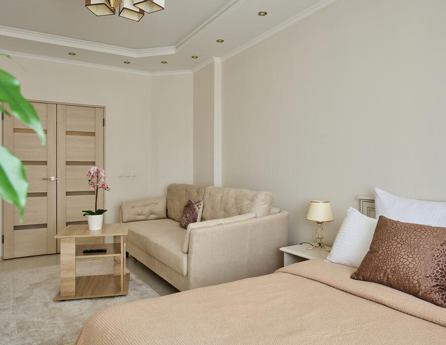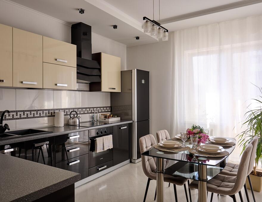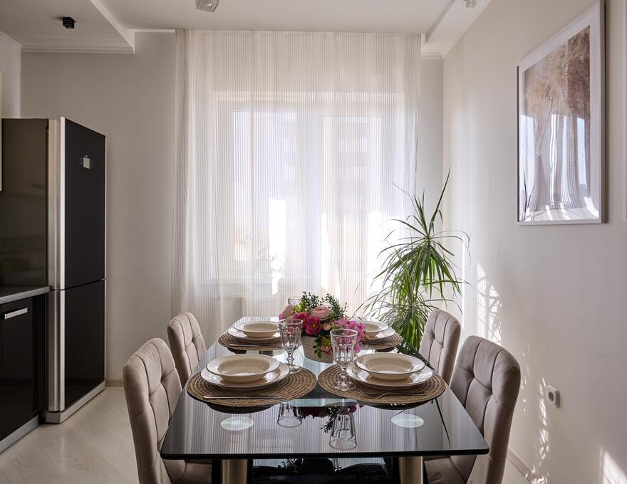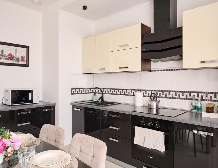 Эти высотки построены в живописном месте с видом на реку и лесопарковую зону. Буквально за пару минут можно сбежать из шумного города в приятную тишину и прохладу заповедного леса. Урочище «Пышки» предлагает все условия для приятных прогулок (проложены дорожки, оборудованы скамейки, действует прокат велосипедов). С другой стороны дома располагаются местный рынок, магазины, кинотеатр, ресторан и ночные клубы. Так что скучать в этом месте никому не придется, каждый гость найдет себе развлечение по душе. Стильная и модная квартира, удачно расположенная возле парка и обеспеченная всей техникой.