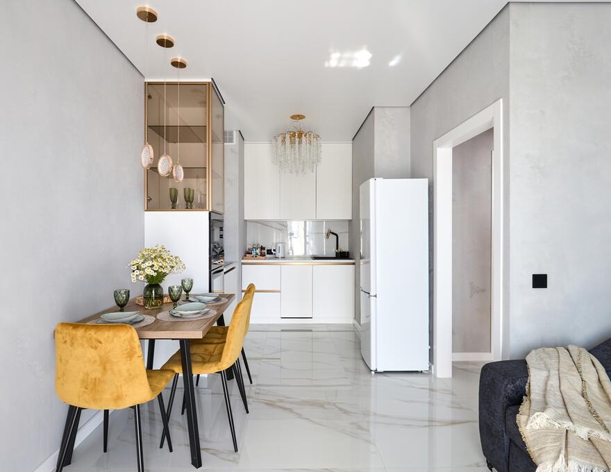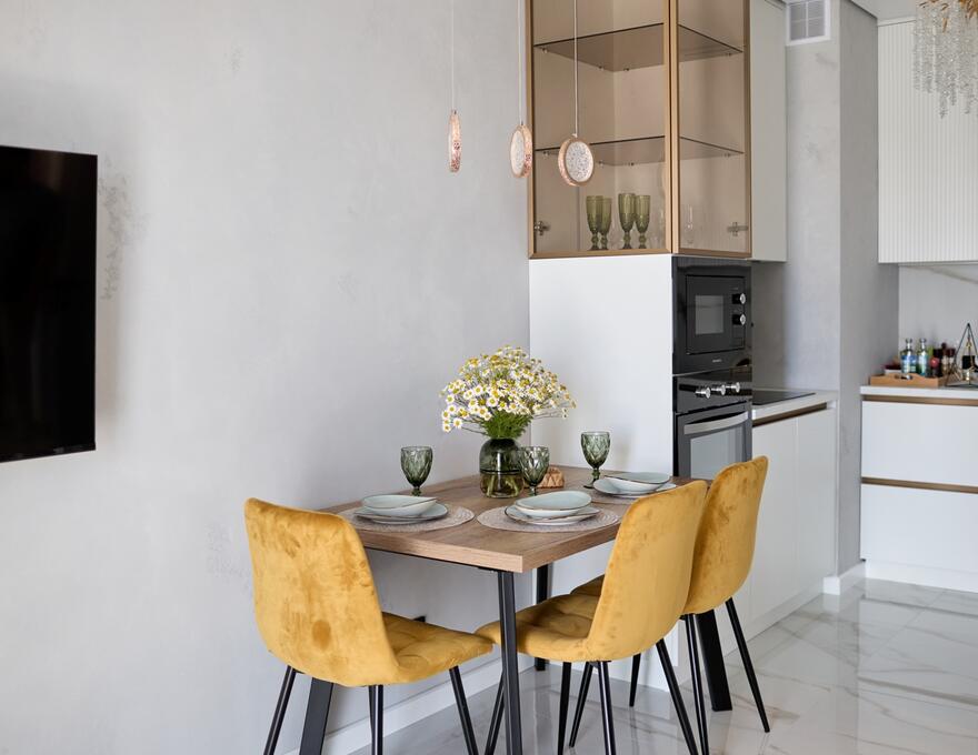 Кухонная зона оснащена необходимым оборудованием: варочная панель, посудомоечная машина, электрочайник, холодильник, микроволновая печь — все, что может понадобиться для самостоятельного приготовления пищи. Также в распоряжении наших гостей набор посуды и столовые приборы.