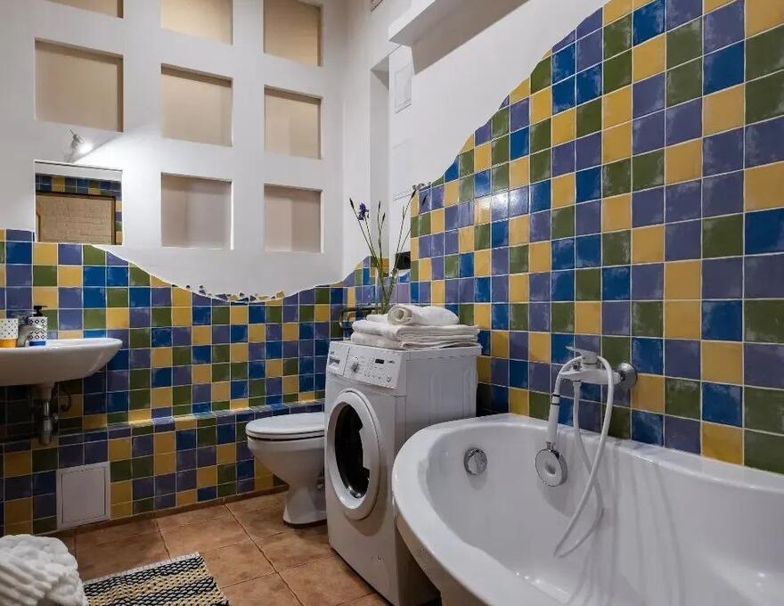 Bathroom: bathroom, washing machine, shower gel, shampoo, detergent, hairdryer, towels.