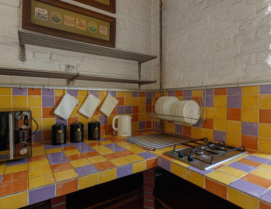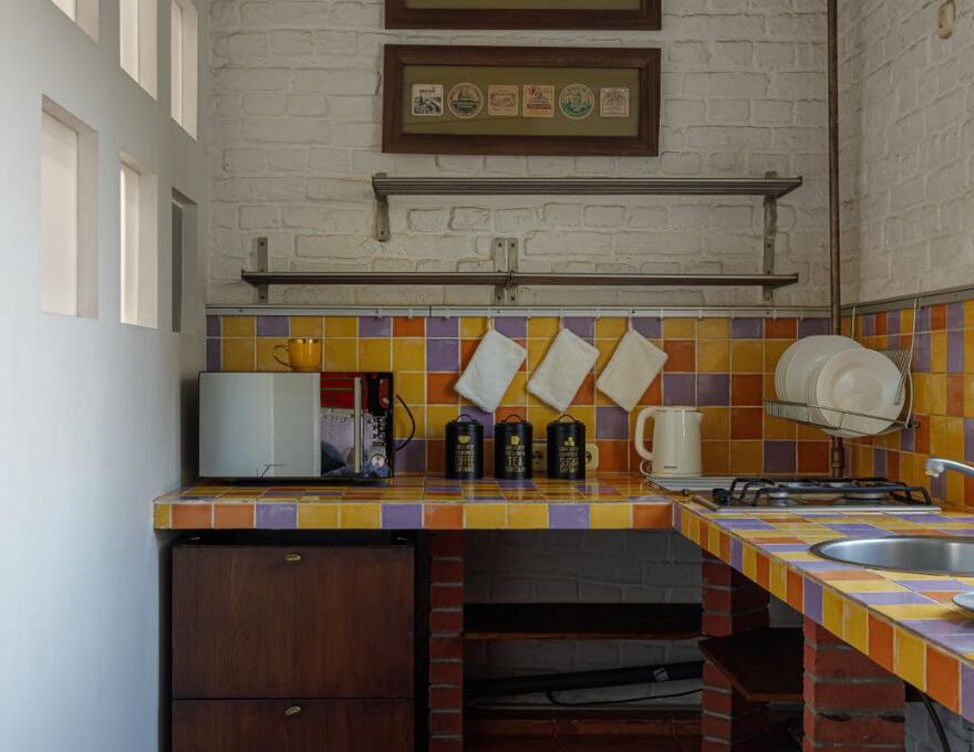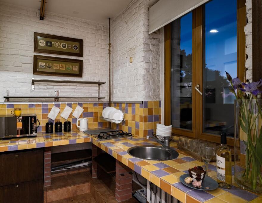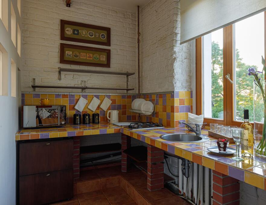 Kitchen: refrigerator, microwave oven, dishes for serving and cooking, tea, coffee, sugar, clean water.