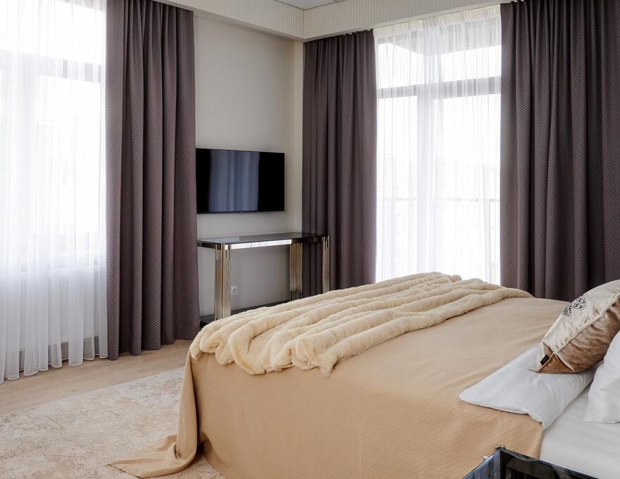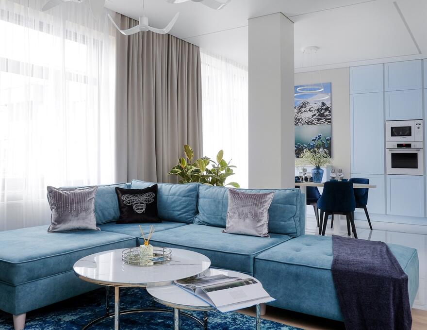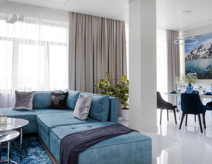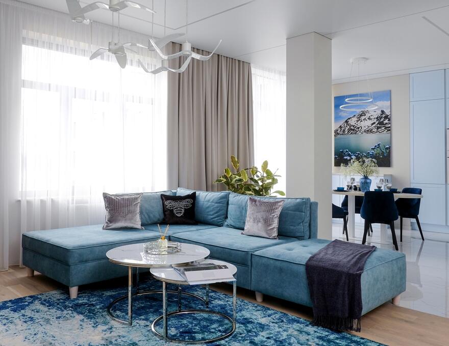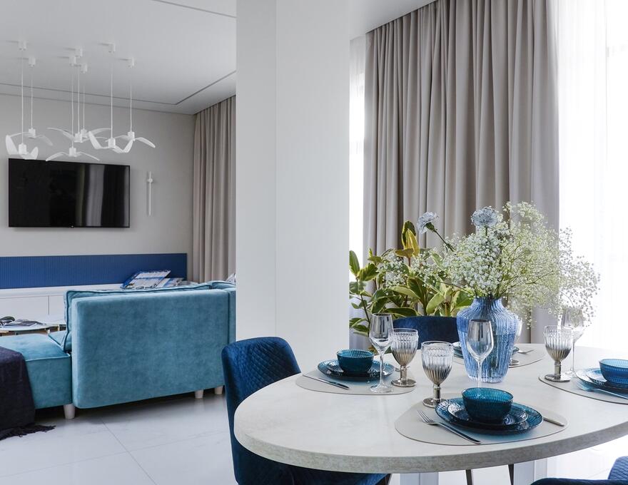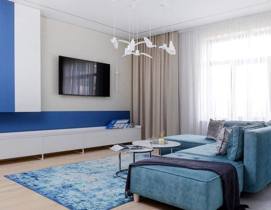 В интерьере органично сочетаются современный и классический стили, создавая нейтральную палитру спокойных синих и бежевых оттенков. Правильная форма помещений и большое количество окон позволили спланировать идеальное пространство, наполненное естественным светом.