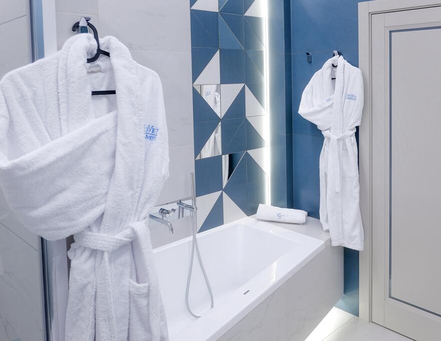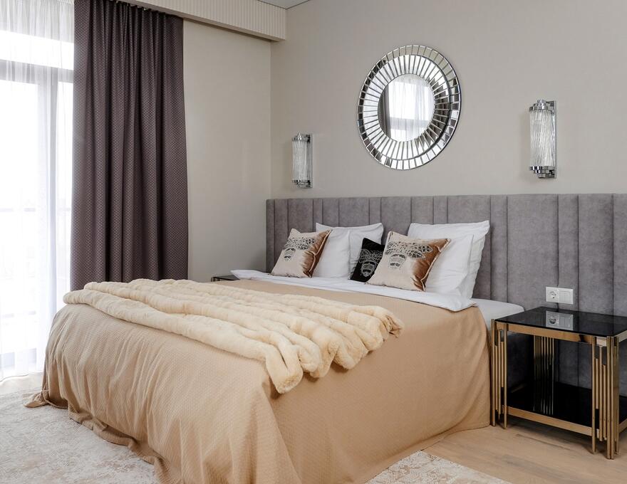 Планировка: кухня-столовая, объединенная с гостиной; спальня с просторной гардеробной; ванна и душ. Техника на кухне вся встроена, что делает ее по-настоящему стильной и современной.